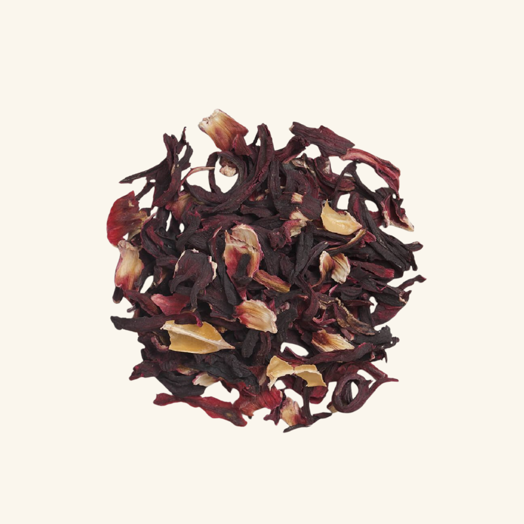 熱帯・亜熱帯で生育する植物「ローゼル」をハーブティーにしたもので、独特の赤色と柑橘系の酸味が特徴です。ビタミンC、クエン酸、カリウムなどが豊富で、抗炎症作用や疲労回復効果で知られ、クレオパトラも愛飲していたと言われています。