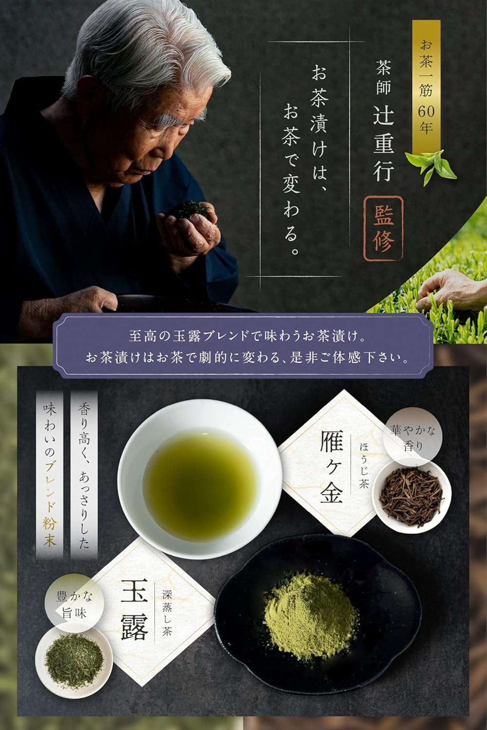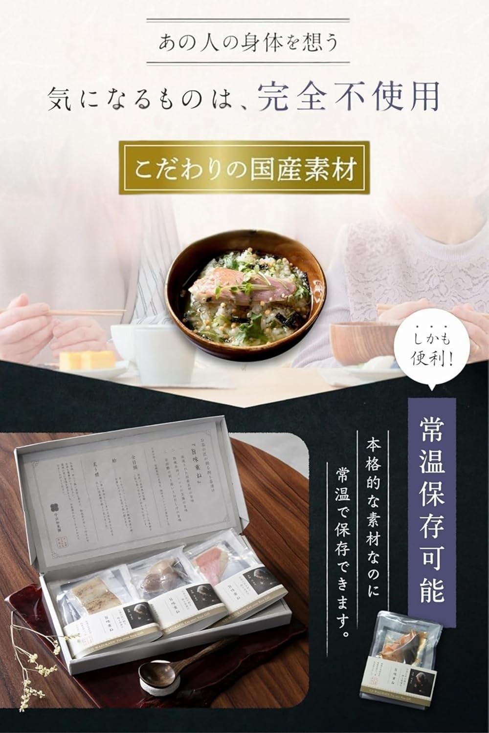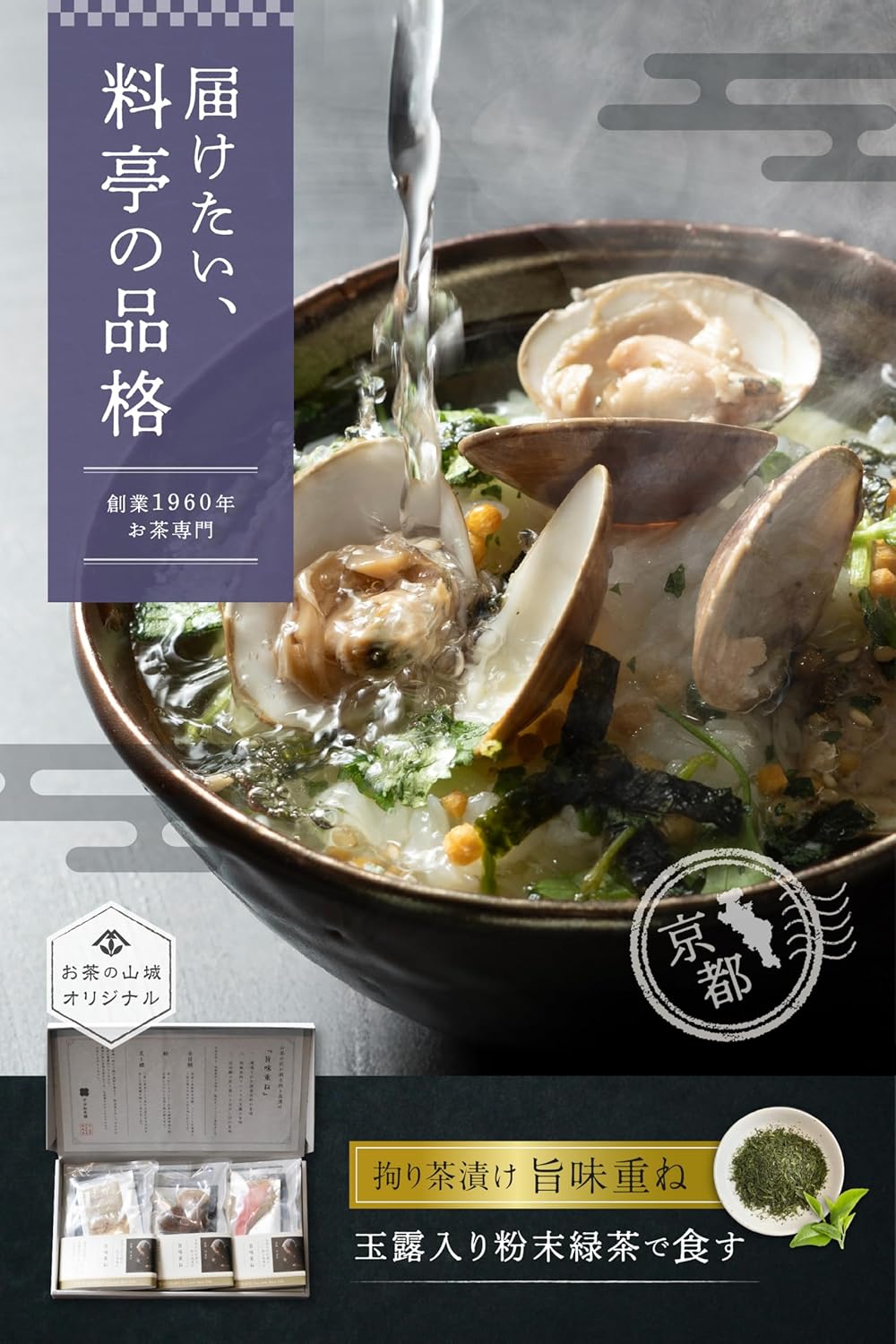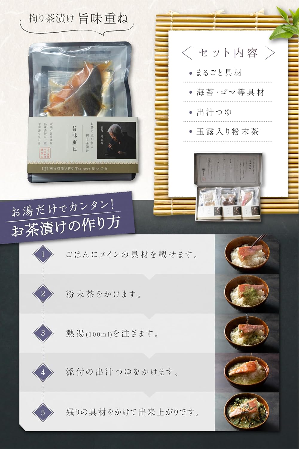 お茶にまでこだわったお茶屋のお茶漬け『旨味重ね』。国産原料を使用した本格お茶漬けのギフトセットです。