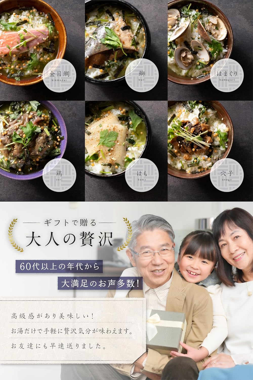 お茶漬け(炭火鶏・穴子・金目鯛切り身・ハマグリ・ハモ切身・鰤照焼き)詰め合わせ |