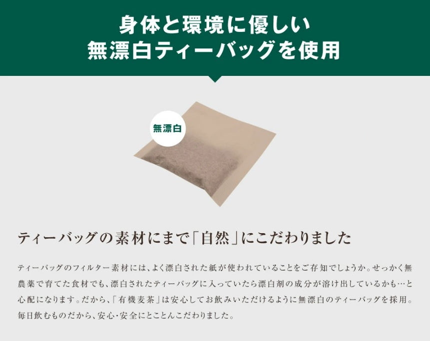 We use organic barley from Shiga Prefecture, grown with plenty of sunlight and minerals from the earth. Organically grown tea is kind to both the drinker's body and the soil in which it is grown.