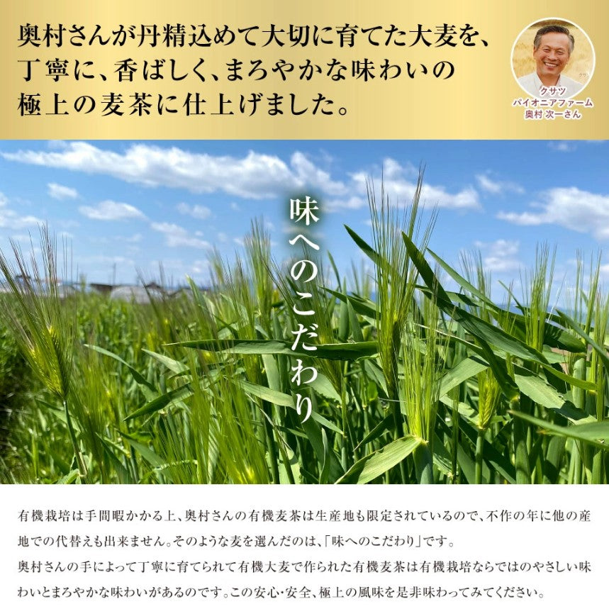 Kusatsu Pioneer Farm Mr. Jiichi Okumura carefully cultivates the barley from Shiga Prefecture to create the finest barley tea with a fragrant and mellow taste.